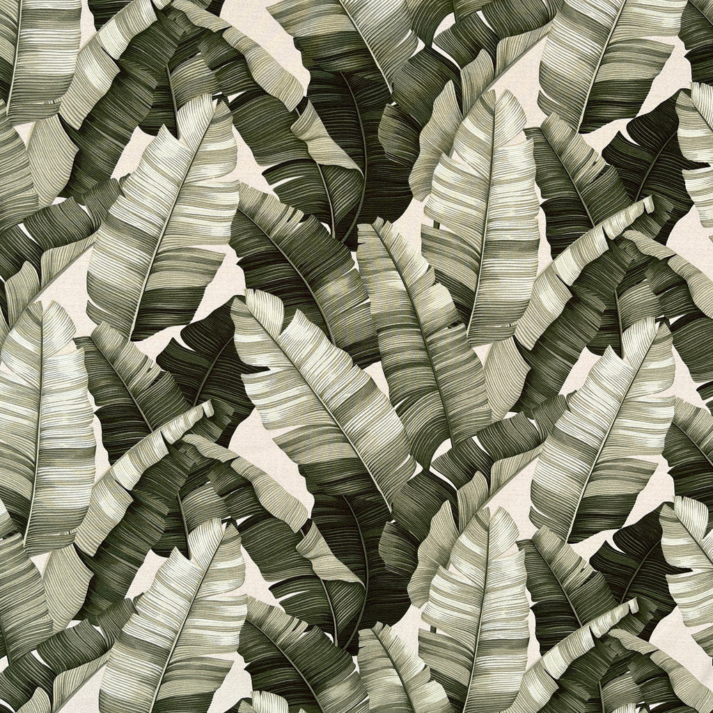 This beautiful bark cloth fabric is accentuated by a wide border of all-over banana leaf design on a contrasting background color. It is great for upholstery or as ottomans and pillows. This heavy-weight cotton fabric is good for both indoors and outdoors.
