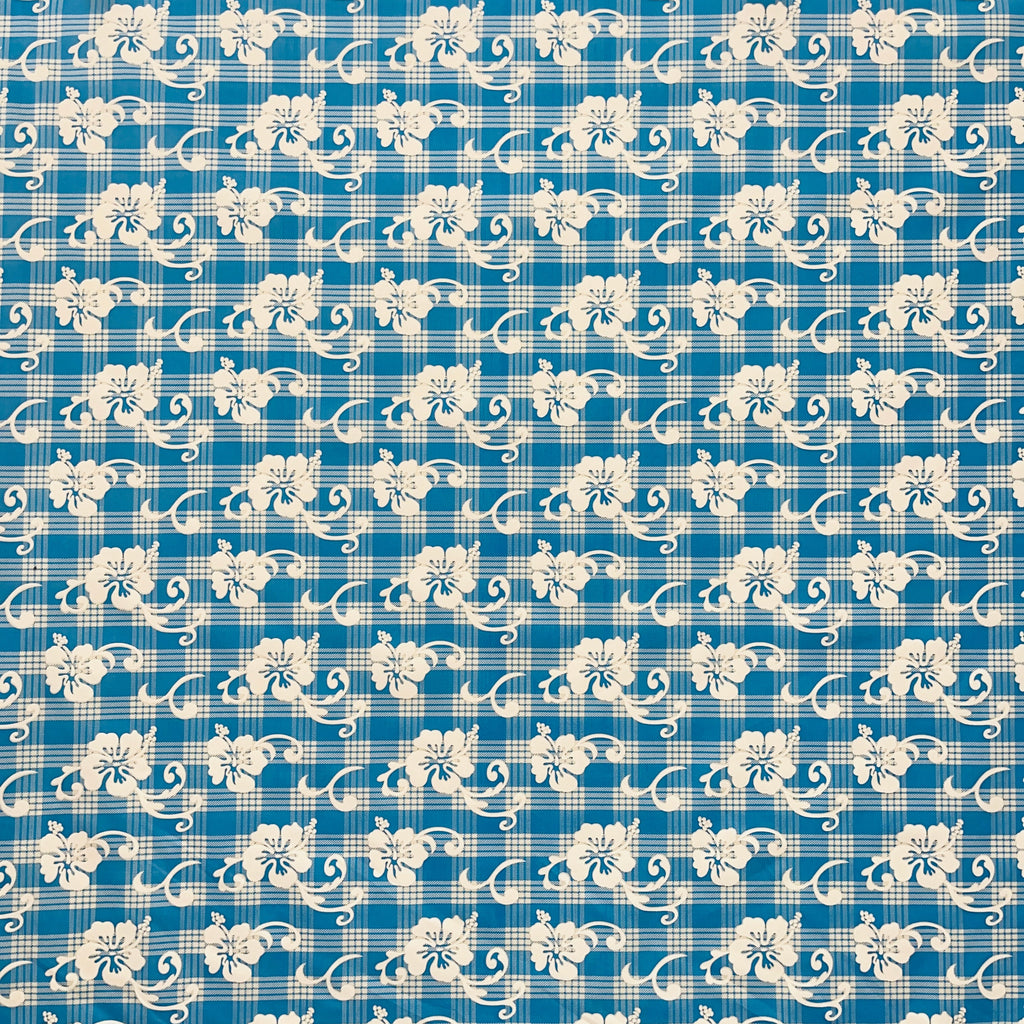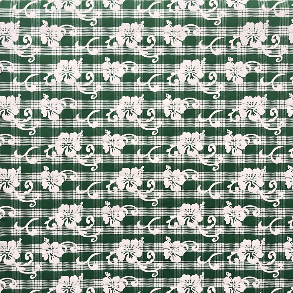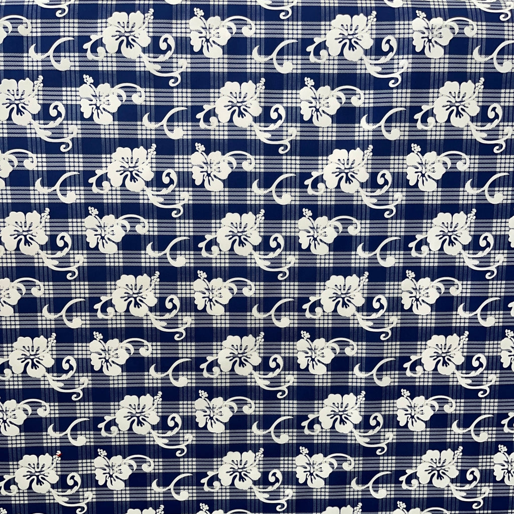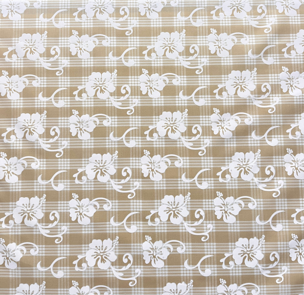 Cotton palaka fabric featuring an elegant hibiscus flower pattern throughout. This traditional Hawaiian-inspired textile combines the classic palaka check design with vibrant hibiscus motifs, perfect for authentic island-themed garments, home décor, or craft projects requiring premium cotton construction.
