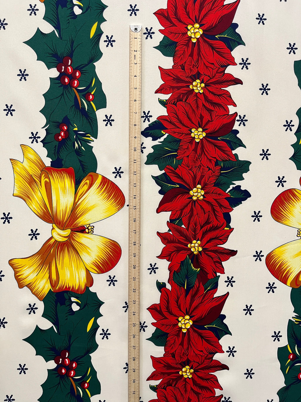 Bring holiday magic to your crafts with this off-white polyester fabric featuring a striking red center border decorated with festive presents. Along the sides, charming Christmas decor— including snowmen, teddy bears, presents, and Christmas trees-add a joyful touch. Perfect for seasonal décor and creative projects, this durable fabric blends classic holiday spirit with lasting quality, making your festive designs truly stand out.