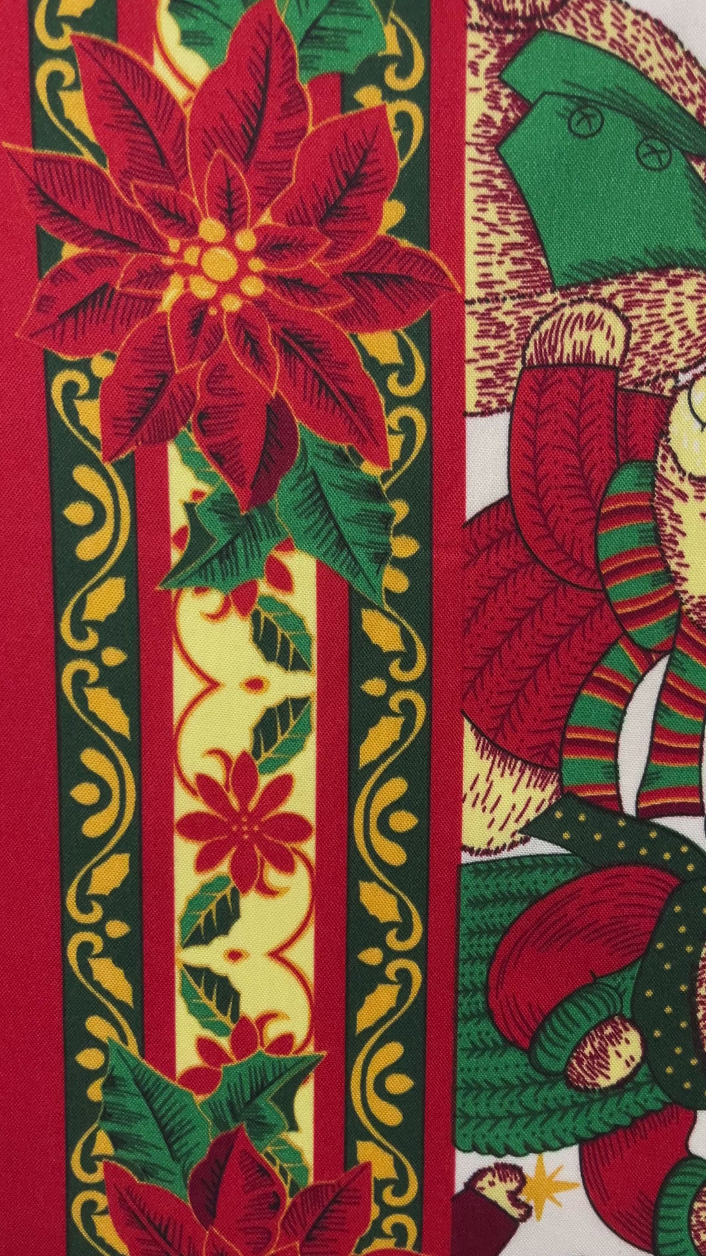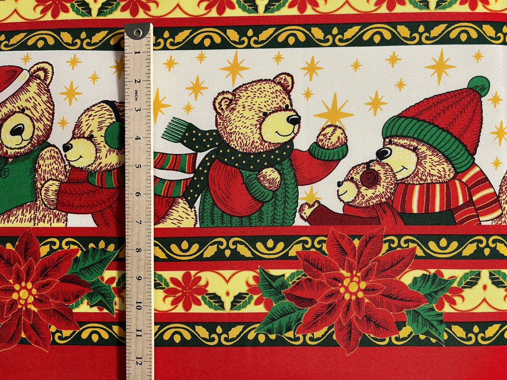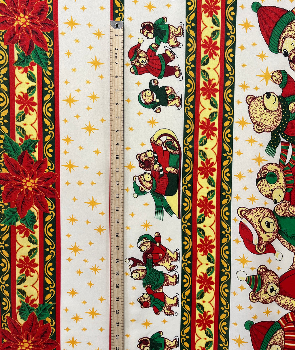 Bring festive cheer to your holiday creations with this charming Christmas fabric! Featuring playful teddy bears in cozy winter outfits, vibrant red poinsettias, and golden star accents, this fabric captures the warmth and joy of the season. Designed in a striped pattern with rich shades of red, green, gold, and ivory, it’s perfect for holiday tablecloths, tree skirts, stockings, apparel, or seasonal crafts.
