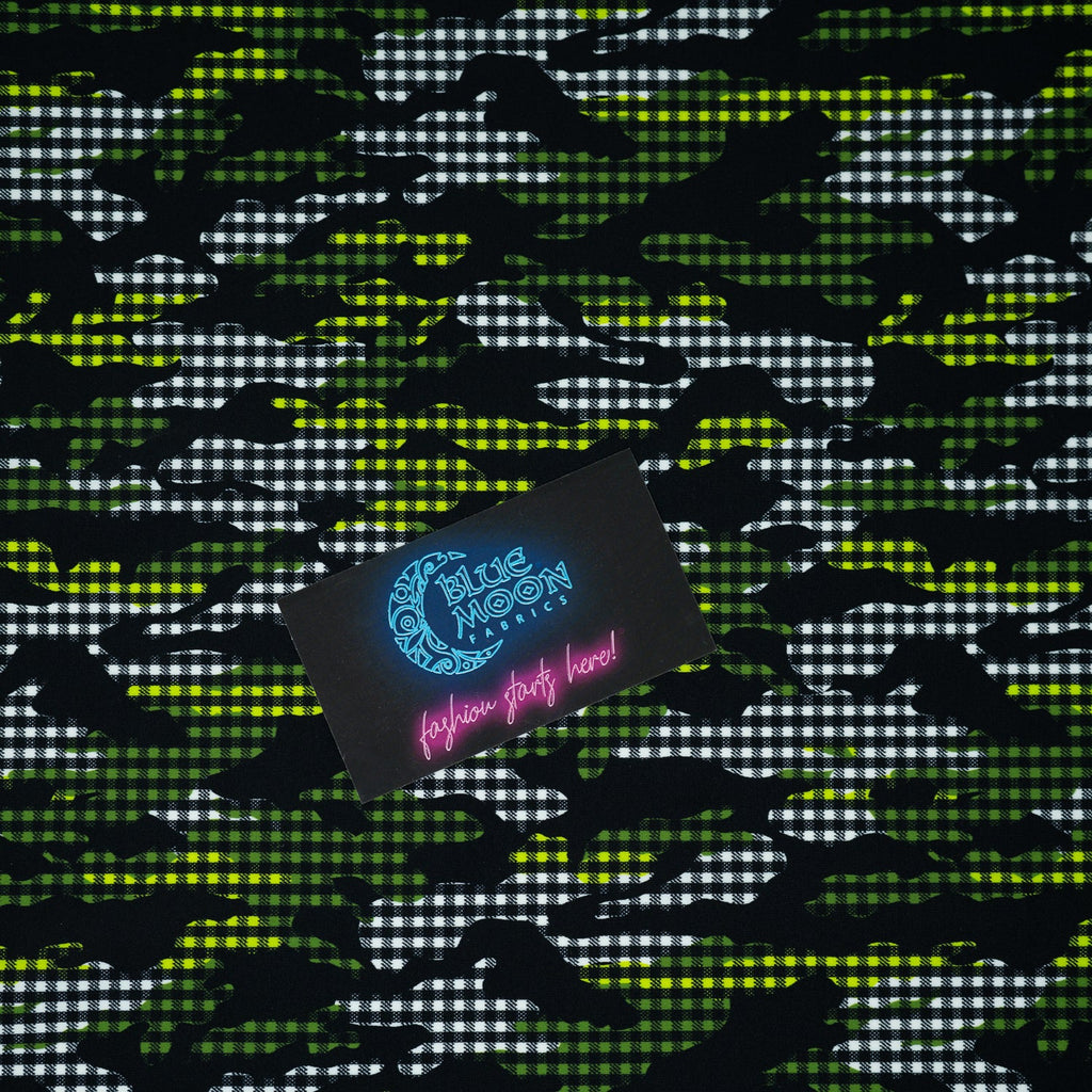 Camouflage Plaid Printed Spandex Fabric is manufactured using high-quality 4-way stretch nylon spandex fabric. This textile was created using a Direct to Ground Digital Printing method allowing the dye to fully saturate into the material achieving vibrant colors and full coverage as you stretch. This fabric can be stretched in all directions and has great recovery as a result of the high spandex content. Specifically engineered for Swimwear, Dancewear, Activewear and Cosplay. This fabric is designed to stand up to rigorous use and wear, from the practice floor to the pool deck. With exceptional durability, it's the perfect addition to your repertoire of fabrics. This fabric is designed to endure long-term use and is an ideal choice for apparel that requires extra stretch, bounce and recovery.