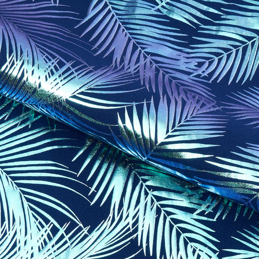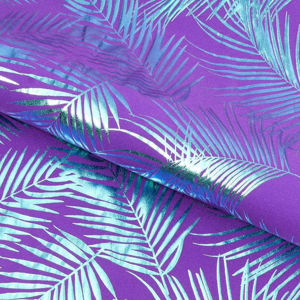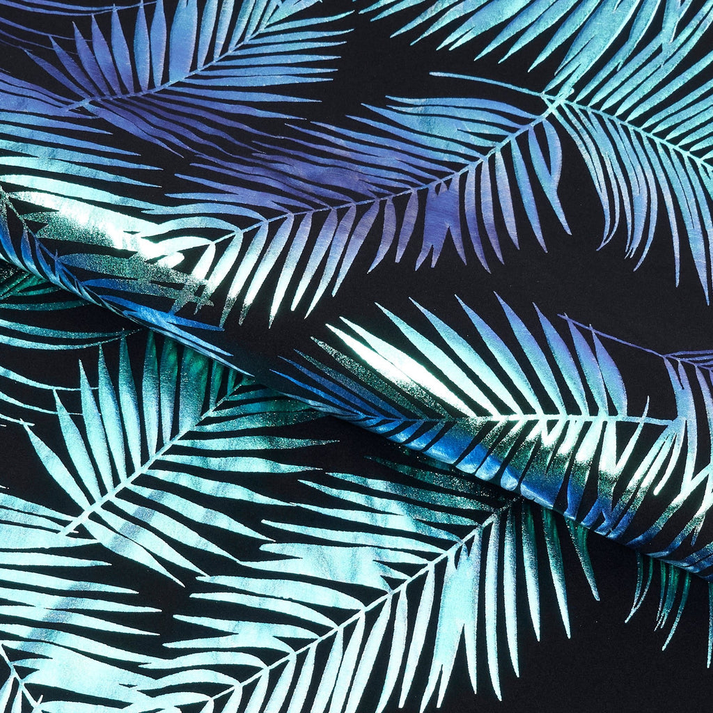 Electric Palm Foil Printed Spandex is a collection of vibrant 2-way stretch matte nylon spandex tricot with an iridescent palm leaf foil print. These fabrics are excellent for swimwear, dance wear, as well as form-fitting fashion. It's perfect for creating garments that stand out from the crowd. Plus, the fabric is easy to sew with and drapes beautifully for a comfortable fit. It's also lightweight making it the perfect choice for sunny days. This unique fabric is soft and breathable, so you'll look and feel supported in whatever you create.