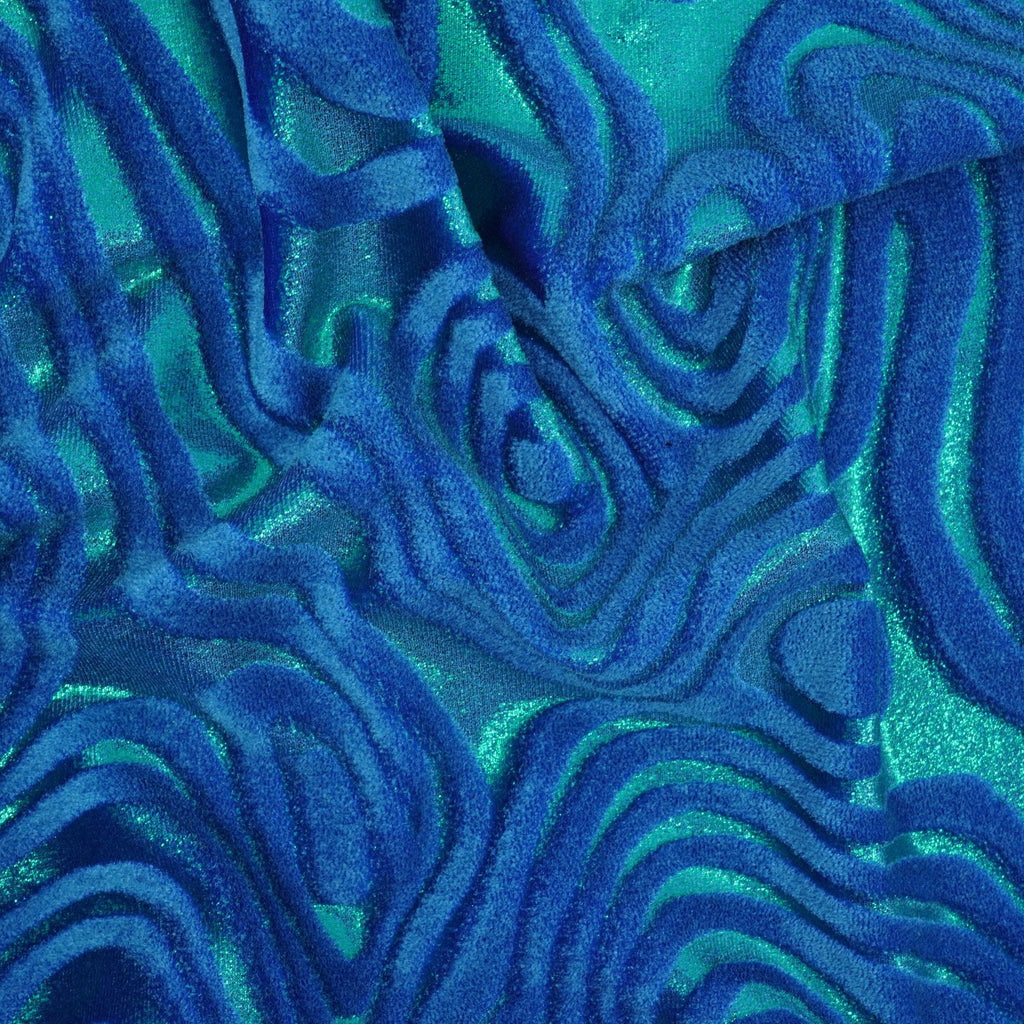 A close-up view reveals the intricate details of this captivating fabric. The soft, luxurious velvet provides a base for the swirling metallic design. The interplay of plush velvet and shimmering foil evokes a sense of opulence and drama to your fashion.