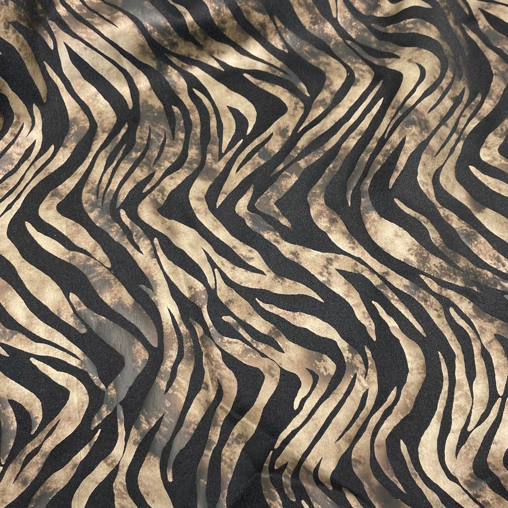 Desert Zebra is a 4-way stretch Nylon Spandex Tricot with Foil Print. This fabric is ideal for performance costumes, dancewear and cosplay fashion. It's soft, lightweight, and breathable making it the perfect fabric choice for dancers and costume designers. The foil print's intricate design adds extra sparkle and shine to any project. Desert Zebra is durable and offers excellent UV protection, making it suitable for more than just costumes; it's also great for outdoor activities. With its versatility and durability, you'll make a statement wherever you go.