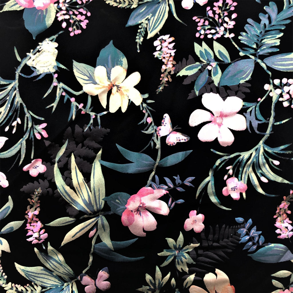 Lotus Foil Printed Spandex This fabric is lightweight and breathable, making it perfect for summery apparel like tanks, crop tops, and skirts. It's durability and unique luster will keep your creations looking good for years to come. With the unique foil print, you can create stunning items that will stand out in any wardrobe.