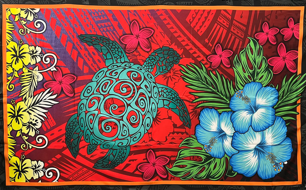 Explore the vibrant beauty of the tropics with our Tropical Floral Assortment Sarong. Adorned with sublimation printed hibiscus flowers against a traditional Polynesian tattoo background, these sarongs also features sea turtles, tapa print, and Plumeria flowers. Immerse yourself in paradise with this stunning addition to your wardrobe.